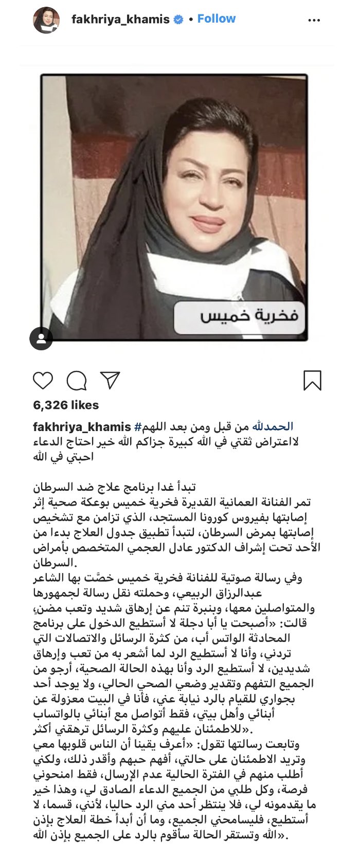 Source: www.alraimedia.com ظهرت الفنانة العُمانية فخرية خميس، في مقطع فيديو عبر حسابها على موقع إنستغرام، وذلك للمرة الأولى عقب إعلان إصابتها بسرطان الثدي بالتزامن مع إصابتها بفيروس كورونا.